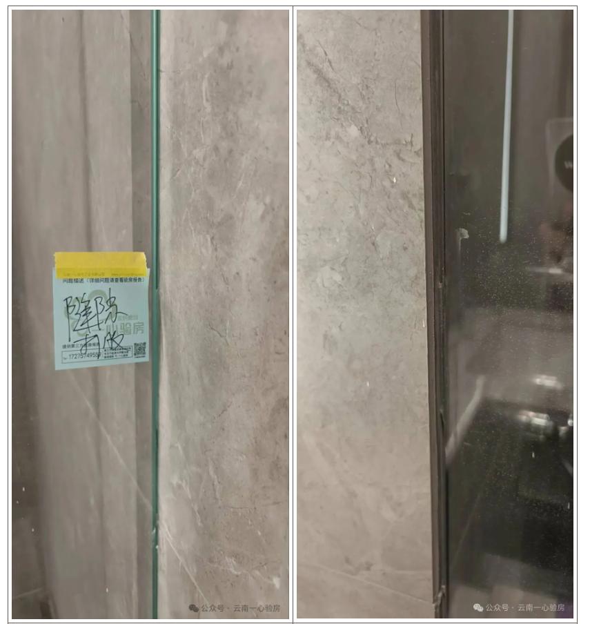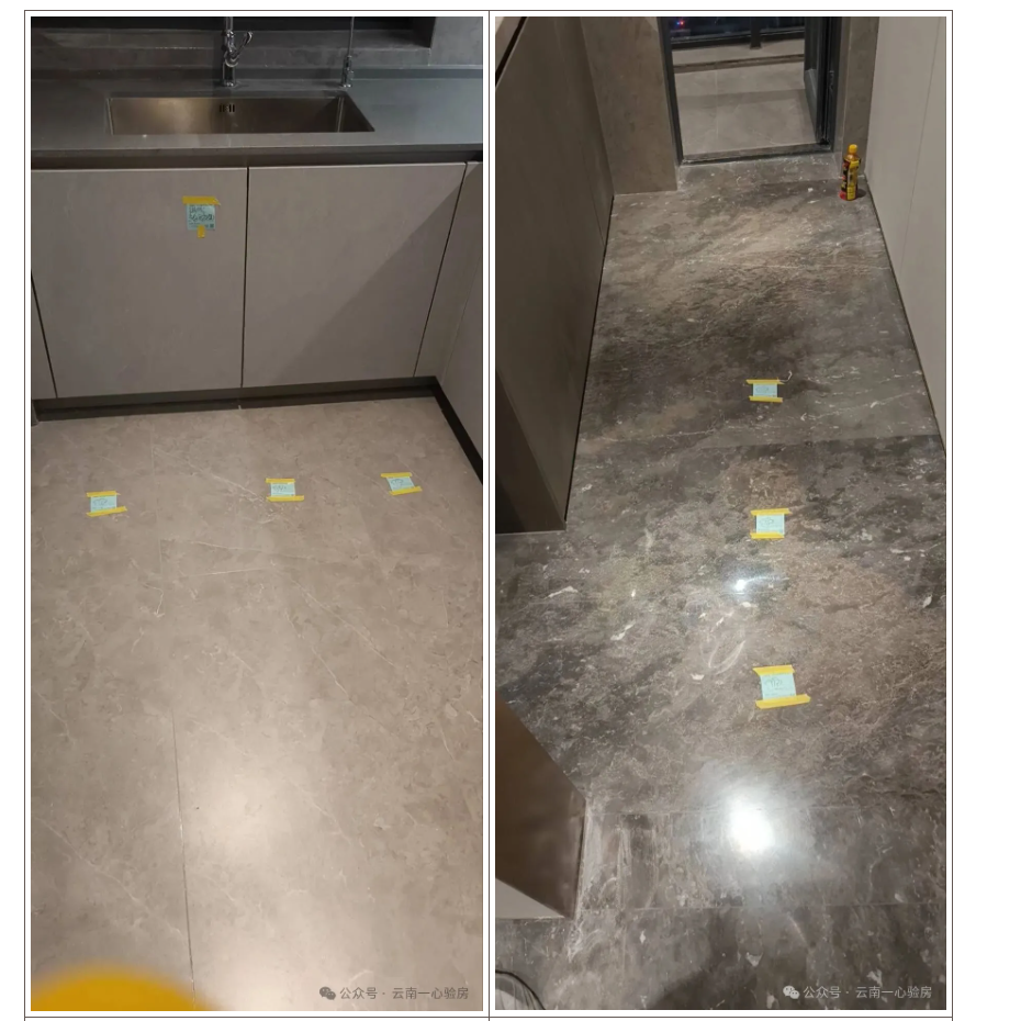 该项目客餐厅地面均采用石材铺设,相较于瓷砖,石材更具质感,拥有独特的纹理和色彩,能够显著提升房屋的整体档次。然而,石材铺设对工艺要求较高。若基层不平整或铺贴工艺不到位,容易导致空鼓及使用后开裂。该户业主家中便出现了多处石材空鼓的问题,这亦是该项目普遍存在的共性问题之一。此外,部分业主家中石材出现大面积空鼓和开裂,需拆除后重新进行铺设。 由于石材具有热胀冷缩的特性,因此在铺贴时需预留1.5-3mm的伸缩缝。若施工不当,后期使用中极易出现开裂现象,业主们可自行检查。