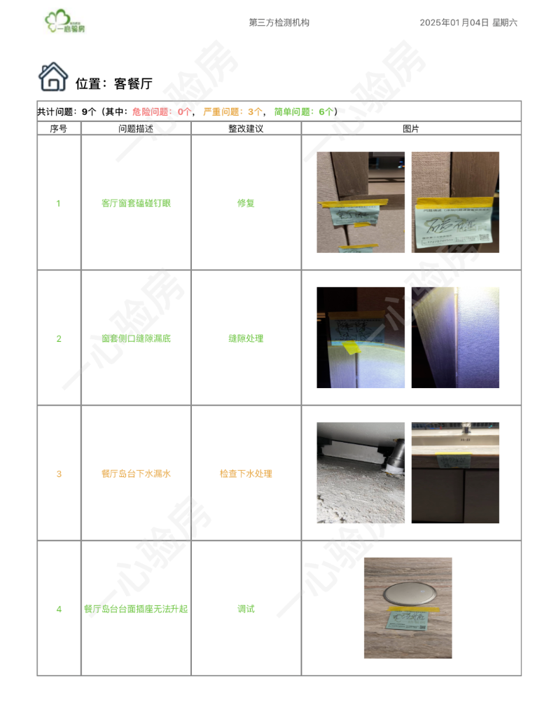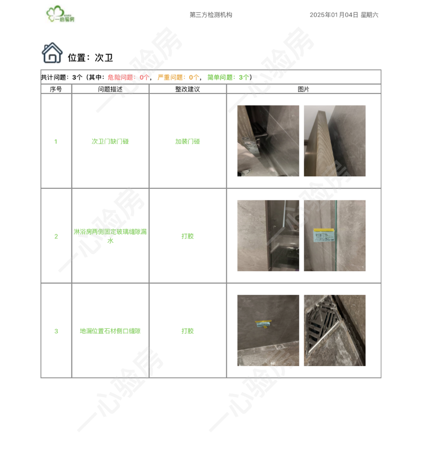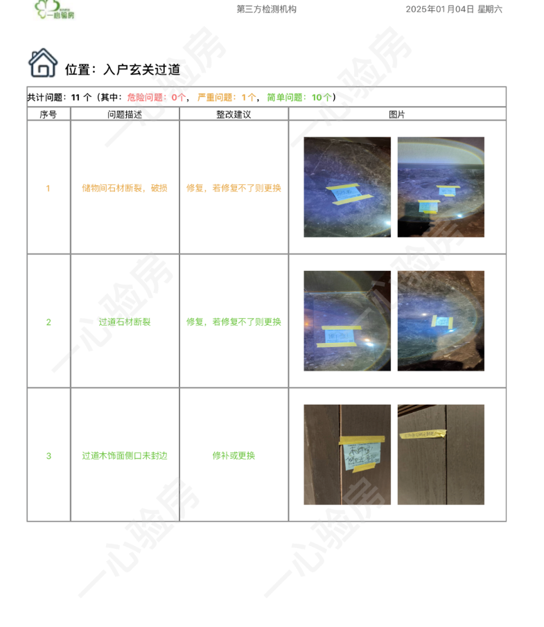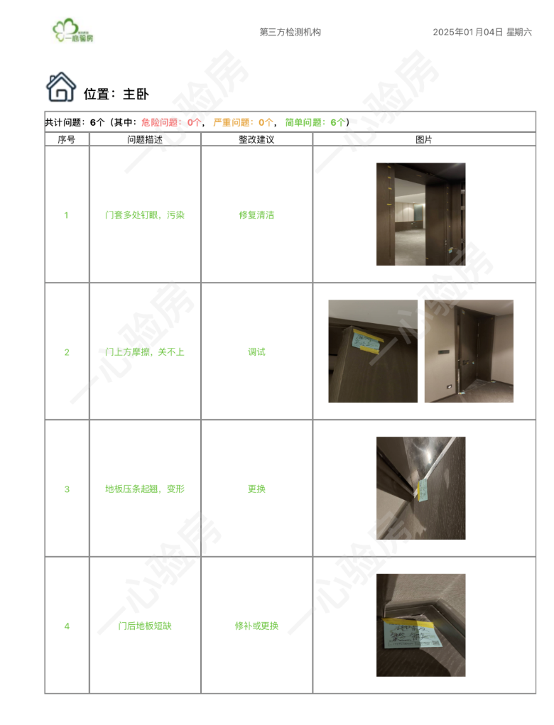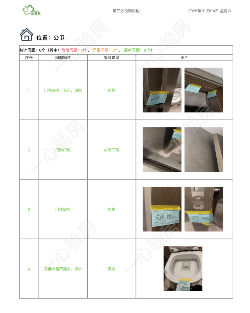 这是我们一心验房验收后罗列出频率较多、较严重的问题。每户业主,我们均会在验房结束后当天内出具验房报告,以便业主查验和相关单位进行整改。