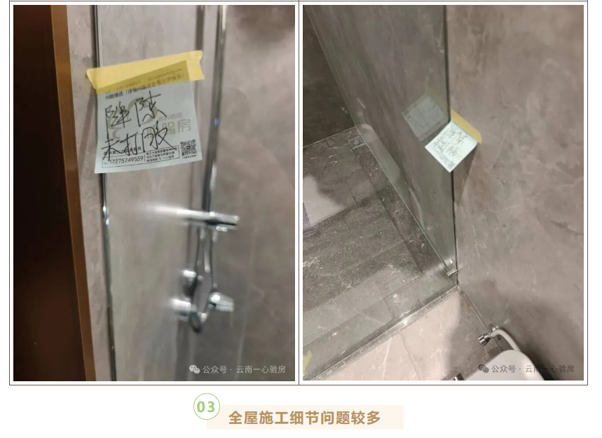 经我们工程师检查发现,全屋三个卫生间的淋浴房两侧玻璃均存在漏水现象,原因是玻璃与墙面之间的缝隙过大,需要重新打胶进行密封处理。 同时,多处上下水区域存在漏水问题,部分阀门安装不牢固。例如,马桶水箱无法储水且漏水、厨房热水三角阀松动、餐厅岛台下水漏水等。业主在使用过程中需特别留意这些问题。