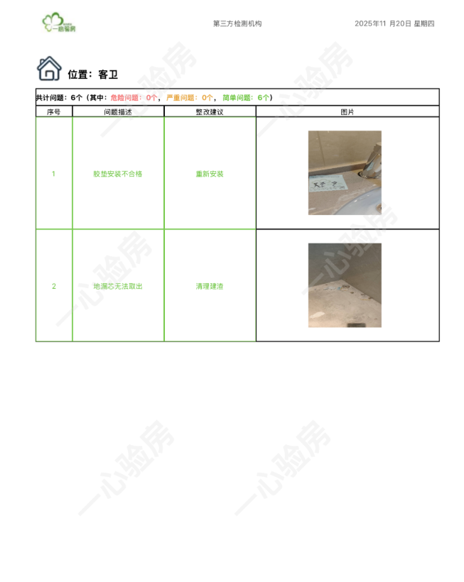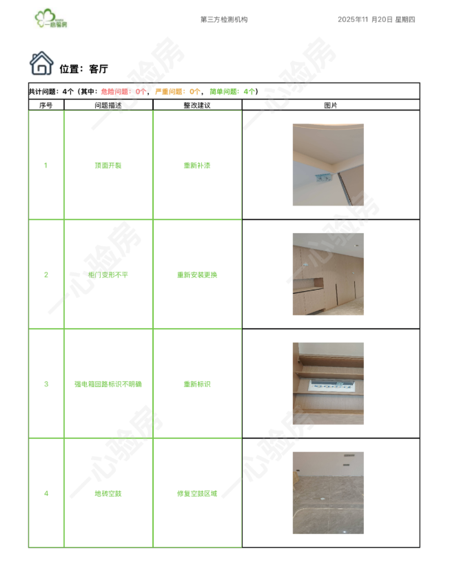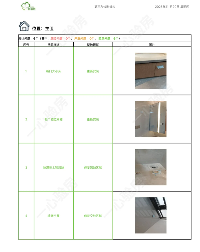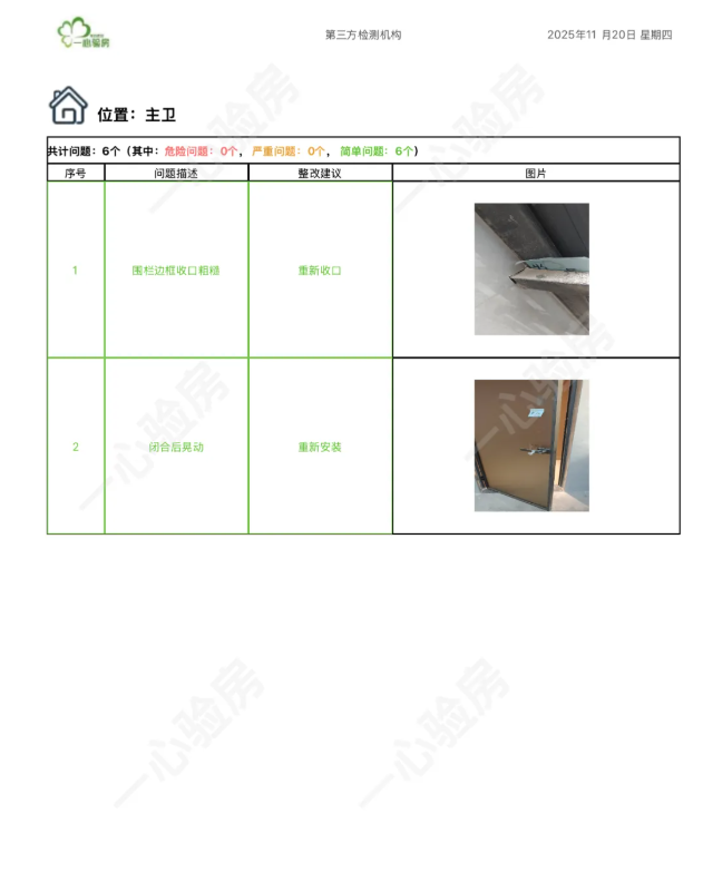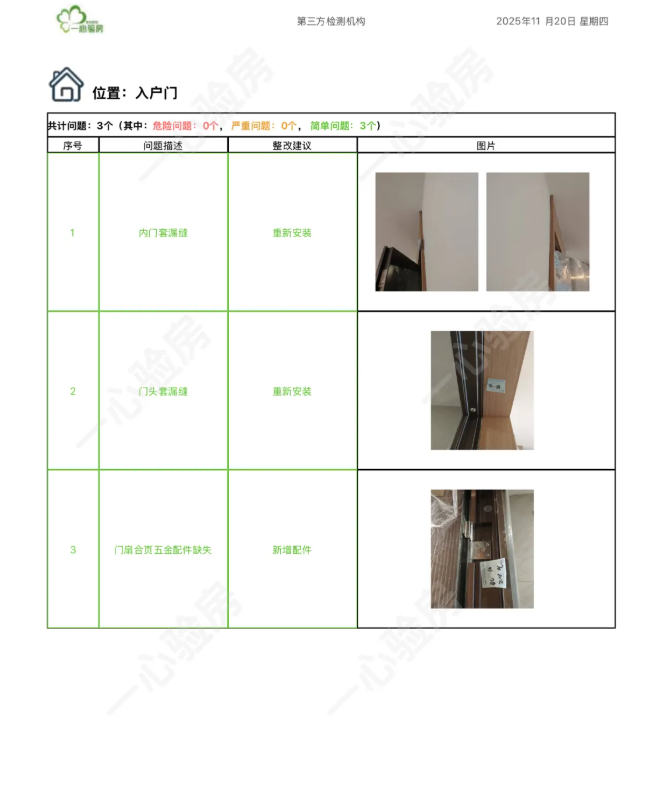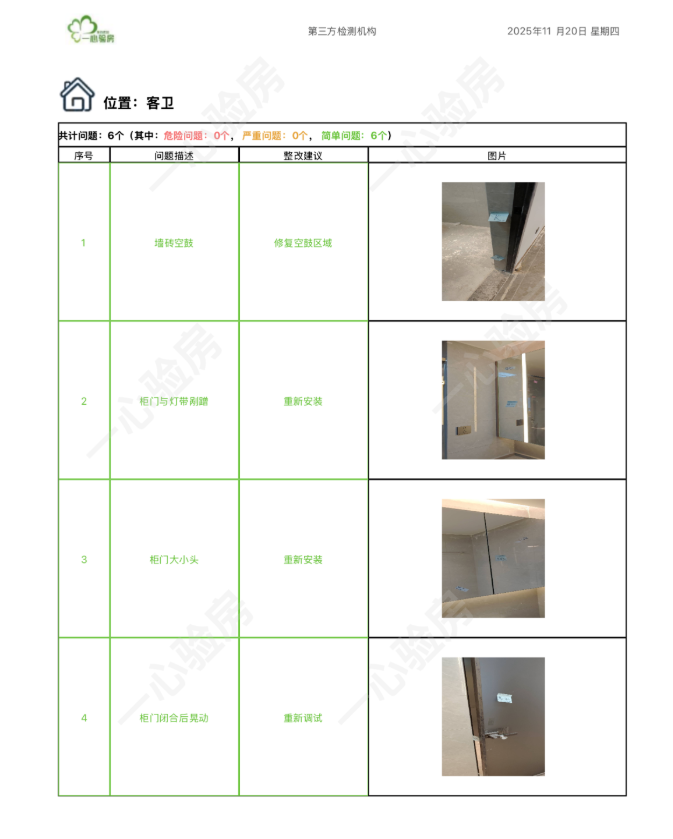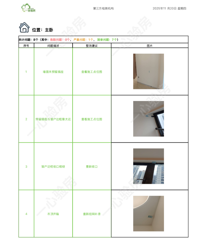 这是我们一心验房验收后罗列出频率较多、较严重的问题。每户业主,我们均会在验房结束后当天内出具验房报告,以便业主查验和相关单位进行整改。