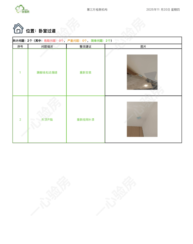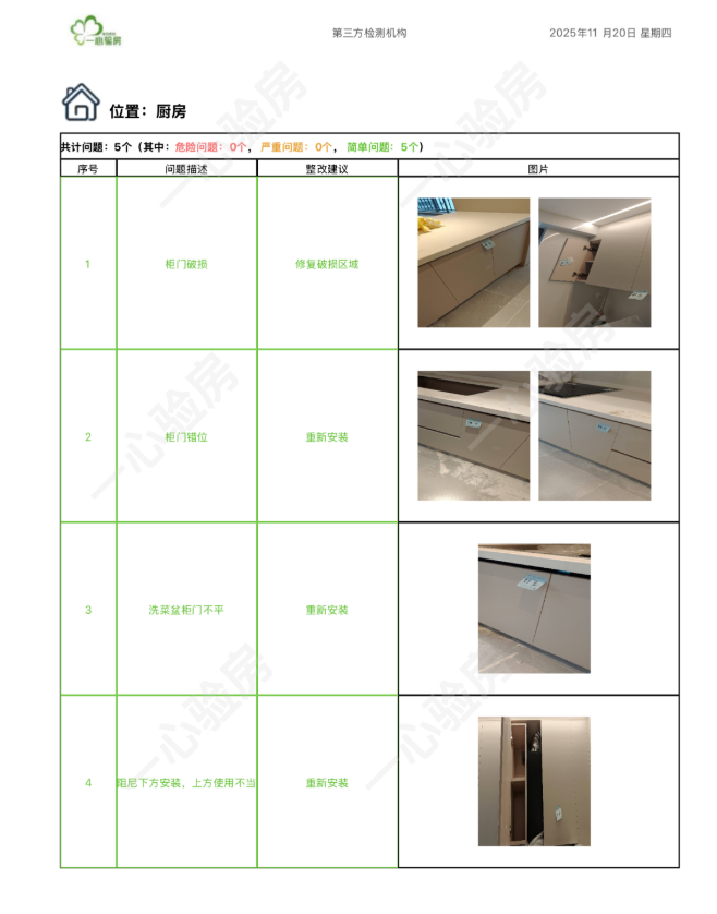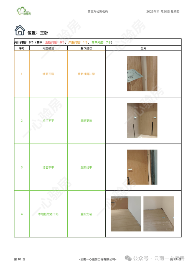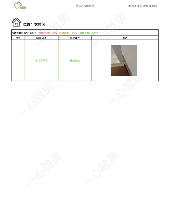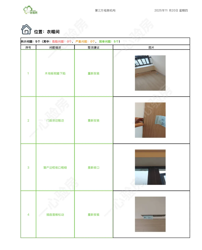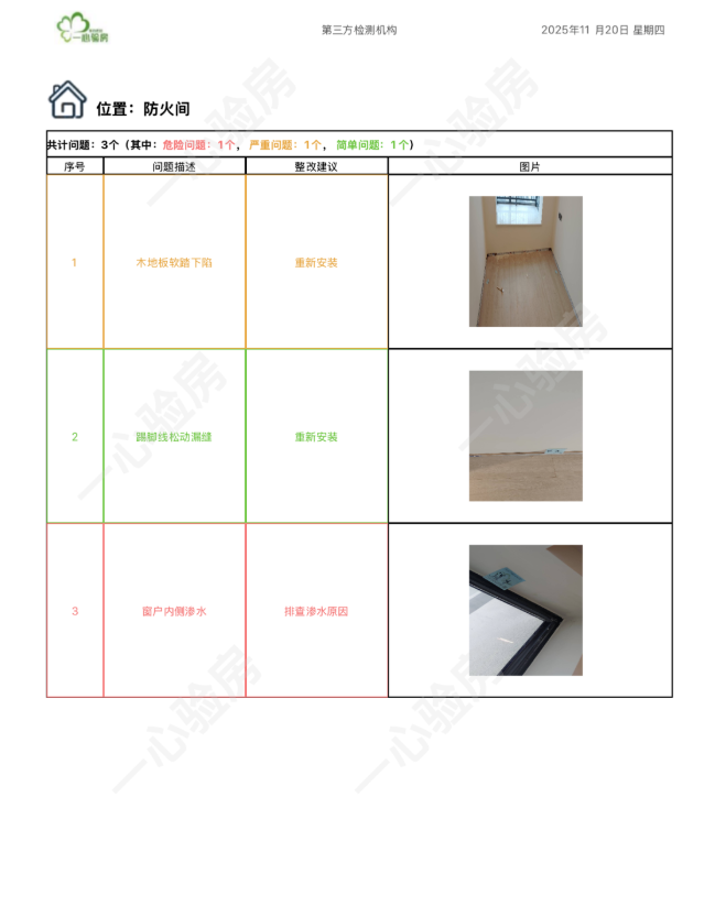 这是我们一心验房验收后罗列出频率较多、较严重的问题。每户业主,我们均会在验房结束后当天内出具验房报告,以便业主查验和相关单位进行整改。